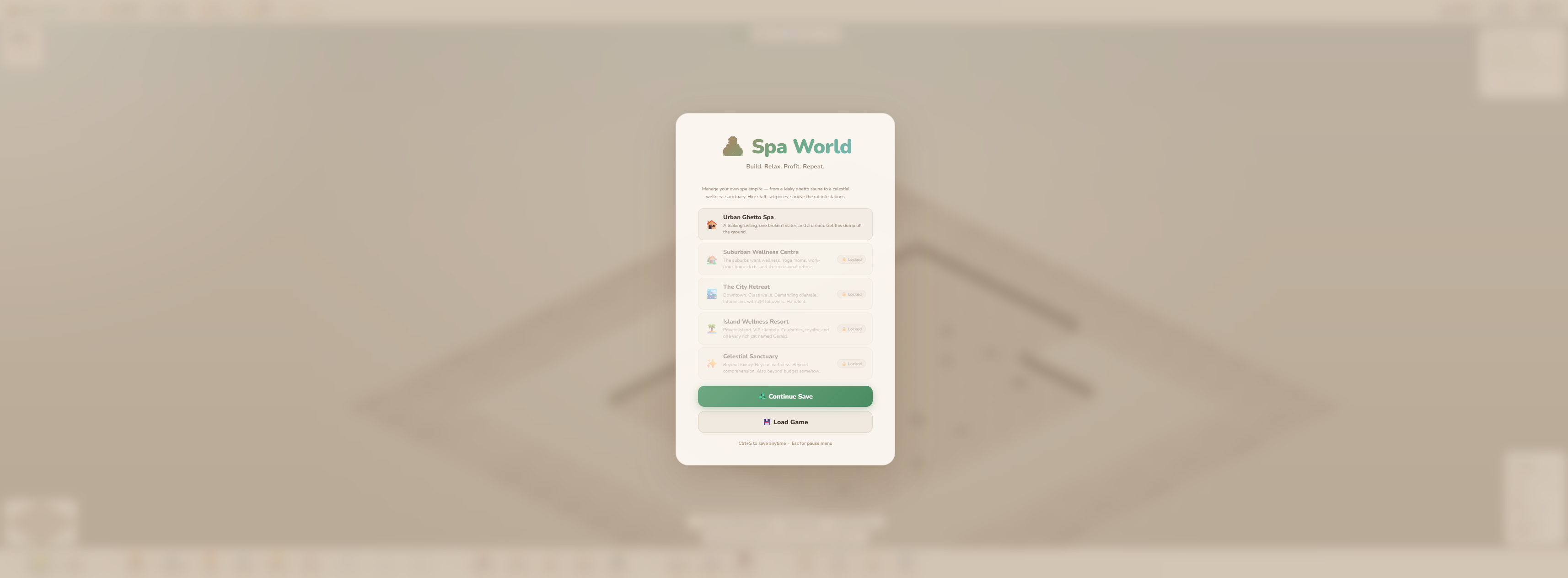 Spa World is a cosy isometric management game where you design and run your own wellness centre — from a bare concrete shell to a five-star sanctuary.