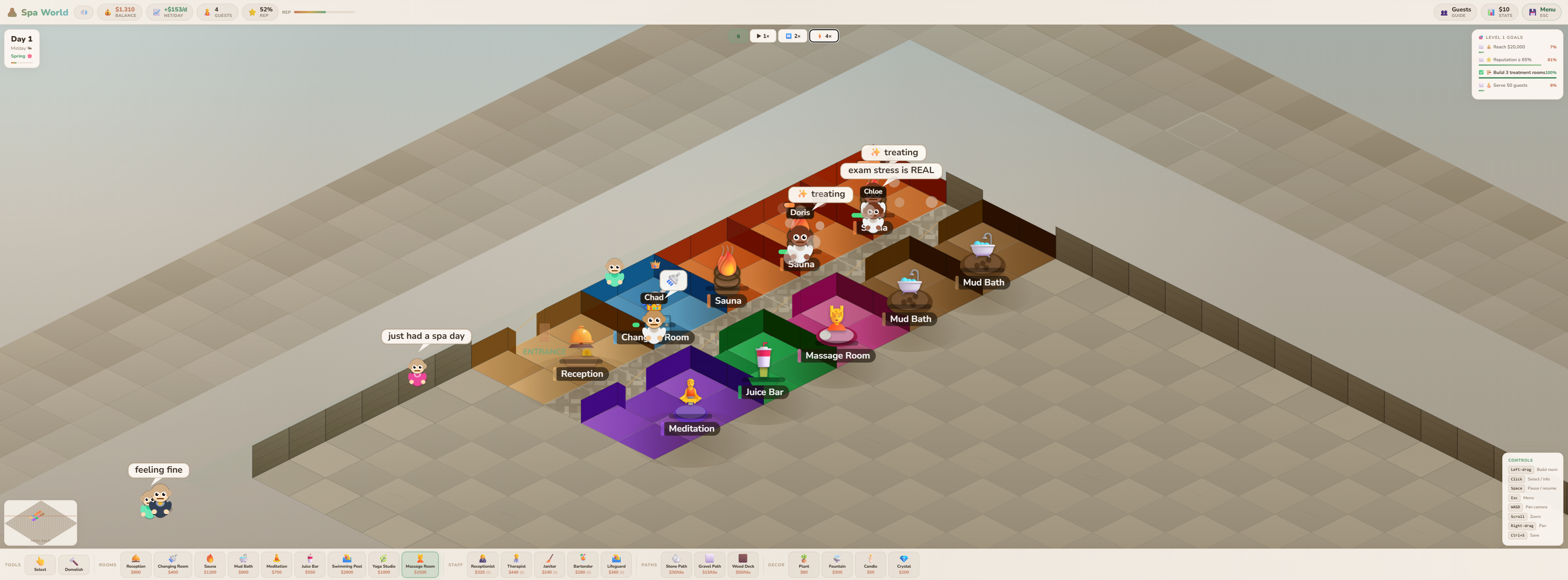 Construct 9 different room types across a procedurally generated building. Reception, Changing Room, Sauna, Mud Bath, Meditation, Juice Bar, Pool, Yoga Studio, Massage Room — each with unique mechanics, staff requirements, and visual props. Lay Dutch klinker stone paths, place decor items like plants, candles and fountains, and expand room by room as your budget grows.