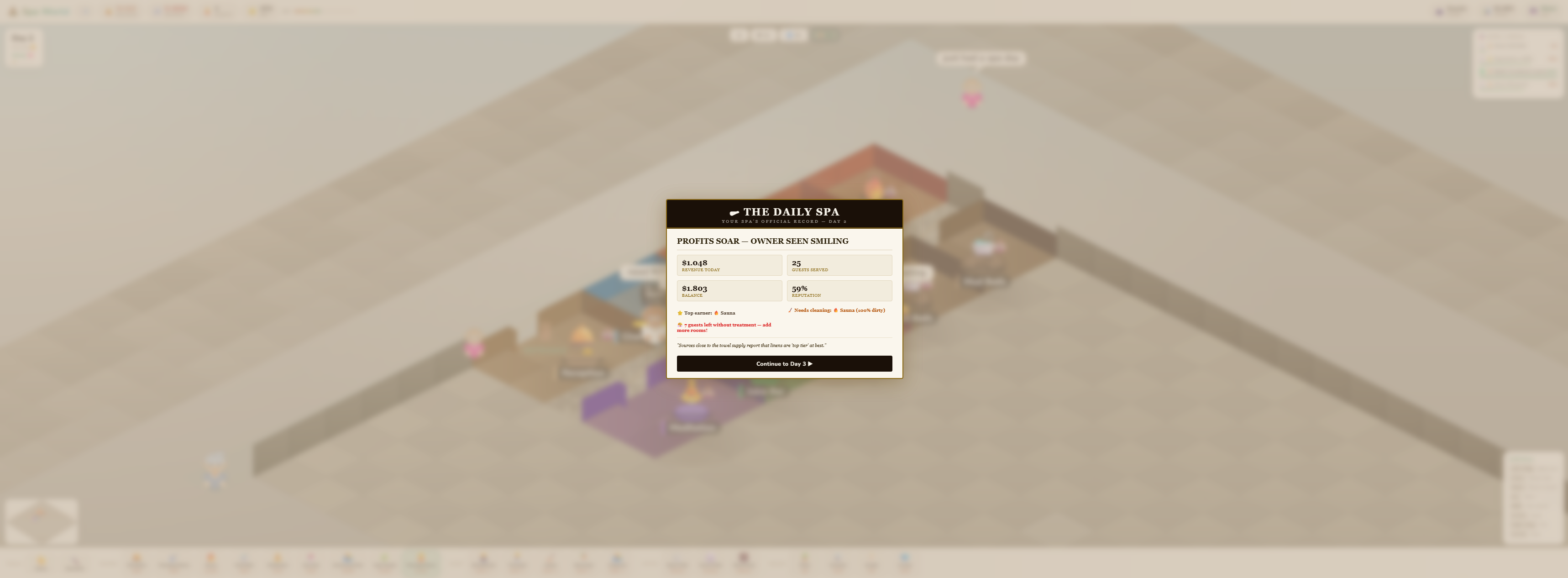 Drag out rooms, lay stone paths, hire staff, and keep your guests relaxed. Every decision matters: a dirty sauna loses reputation, an understaffed changing room creates a queue, and a VIP who leaves untreated can torpedo your rating overnight.